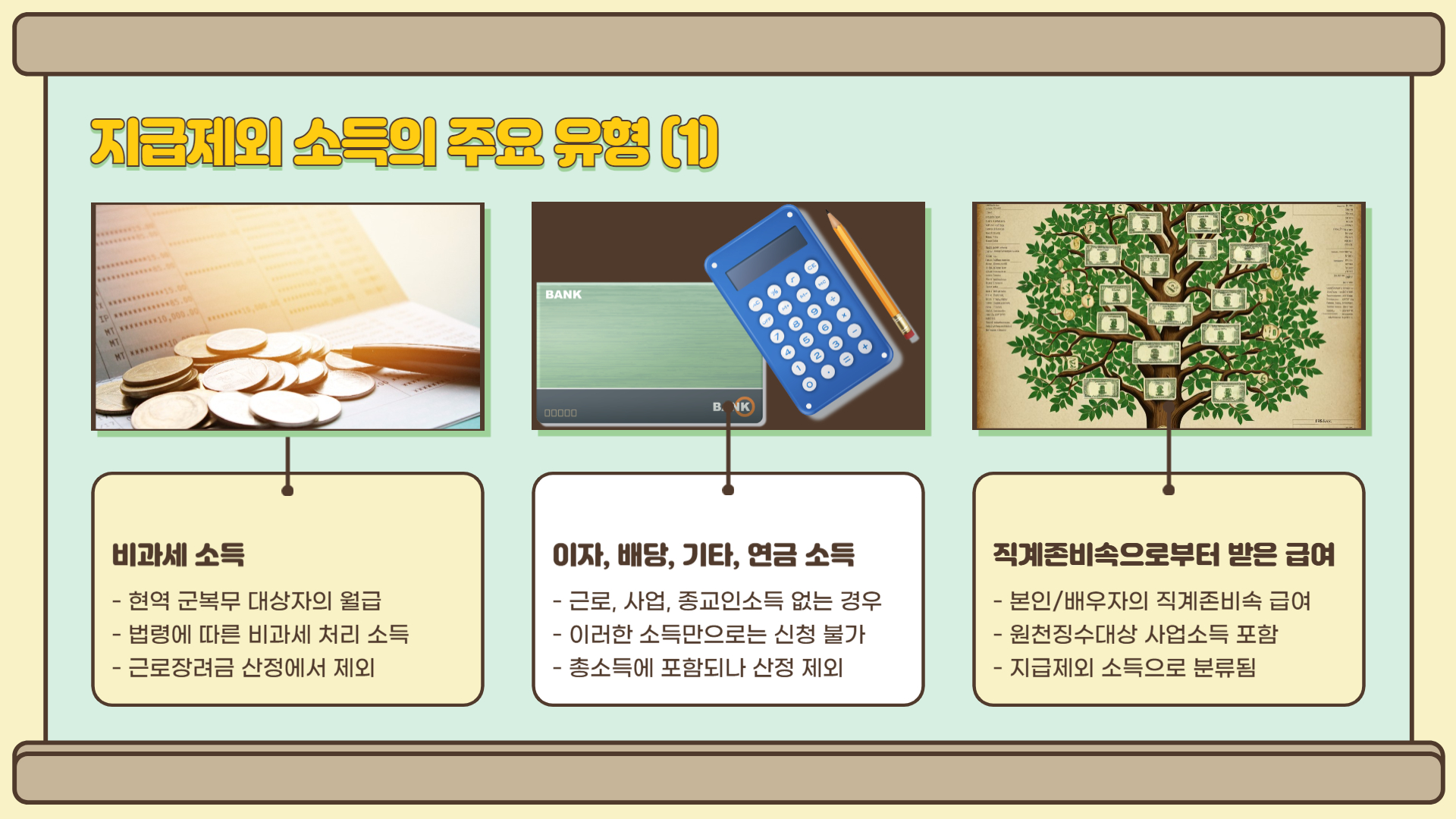 - 이자, 연금, 인정상여, 가족 급여 등은 지급제외 소득