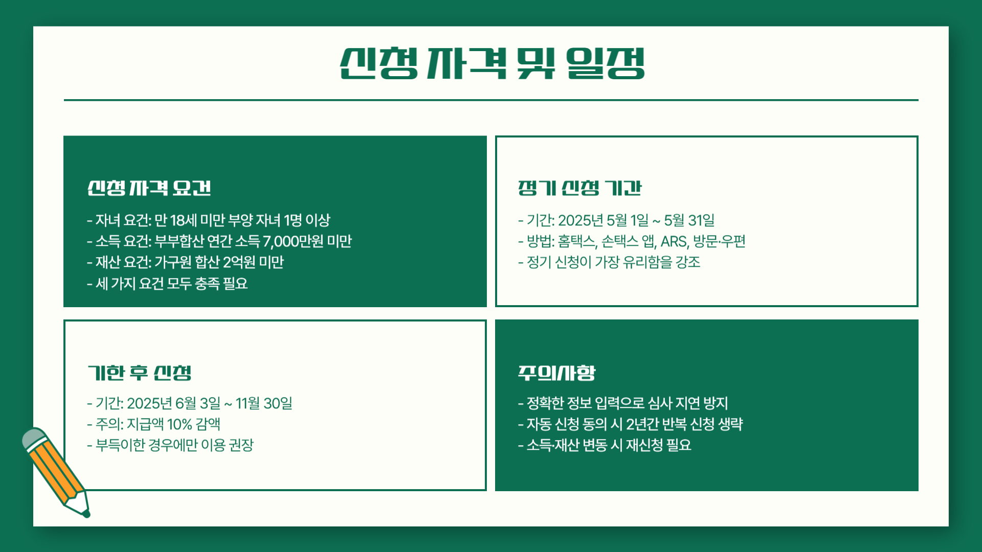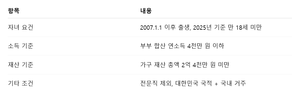 📌 반드시 **세 가지 요건(자녀·소득·재산)**을 모두 충족해야 신청 가능합니다.